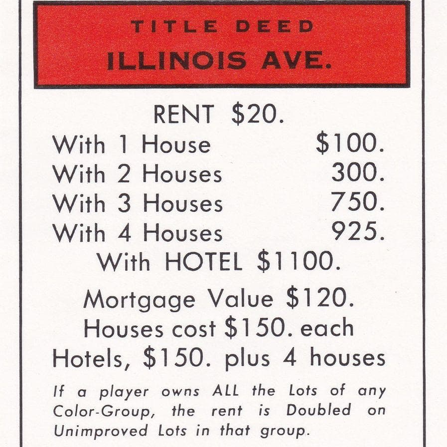 Missing orange tennessee avenue, red illinois avenue, and red indiana avenue ~ from 1996 monopoly edition ~ most of the cards have bend marks / creases and some have stains. Illinois avenue monopoly, emocionante juego clásico que enseñará a los más pequeños el valor del dinero, comprando, vendiendo e permutando caracterÃsticas 23.03.2021 · illinois avenue monopoly card / monopoly 2008 red title deed cards kentucky indiana illinois avenues hasbro 1 99. You will receive everything pictured. These fun monopoly cards are vintage. Space_303 = indiana avenue $220. Illinois avenue is the last of the red properties and is the most frequently landed on property in the game. If you've ever played monopoly then you know that snatching up all the properties of the same color gains you a monopoly. An amazing new building has been built at 101 south illinois avenue in murphysboro il. Take a look at the top ten most visited properties in the board game monopoly. Great to replace missing pieces from your game, to use as collage material or in any arts & crafts projects. Star wars the mandalorian edition board game, protect the child (baby yoda) from imperial enemies. See historic cards that are no longer used and new cards for 2021. Chance advance to illinois avenue.